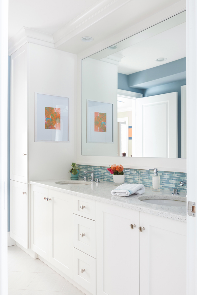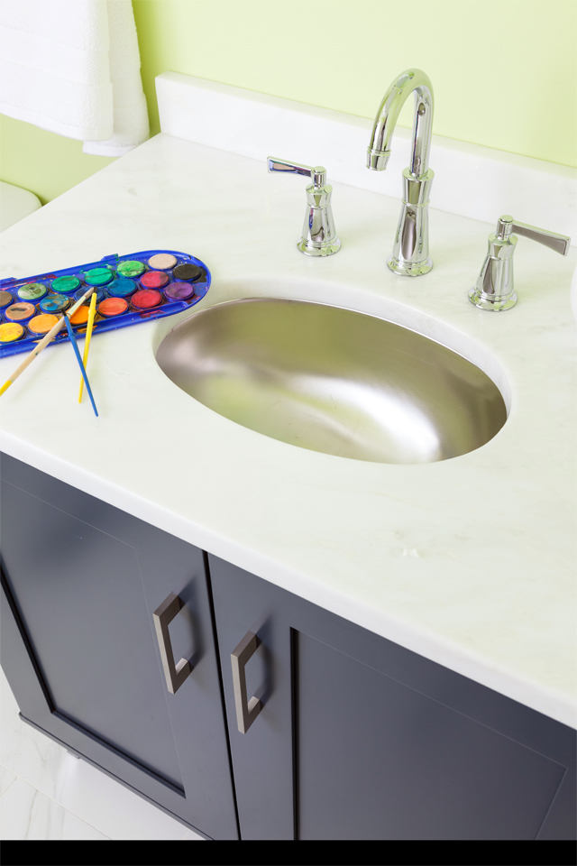 Because this bathroom is adjacent to a playroom and kid’s craftroom, the colors are bright and cheerful. A stainless steel sink was used for durability with art supplies.